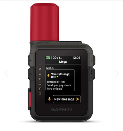 The device supports satellite-based messaging and emergency response coordination when paired with an active service subscription and can connect to compatible mobile devices for expanded mapping and communication features. Its compact size allows it to be carried on a pack, belt, or mounted in a vehicle without adding significant weight.