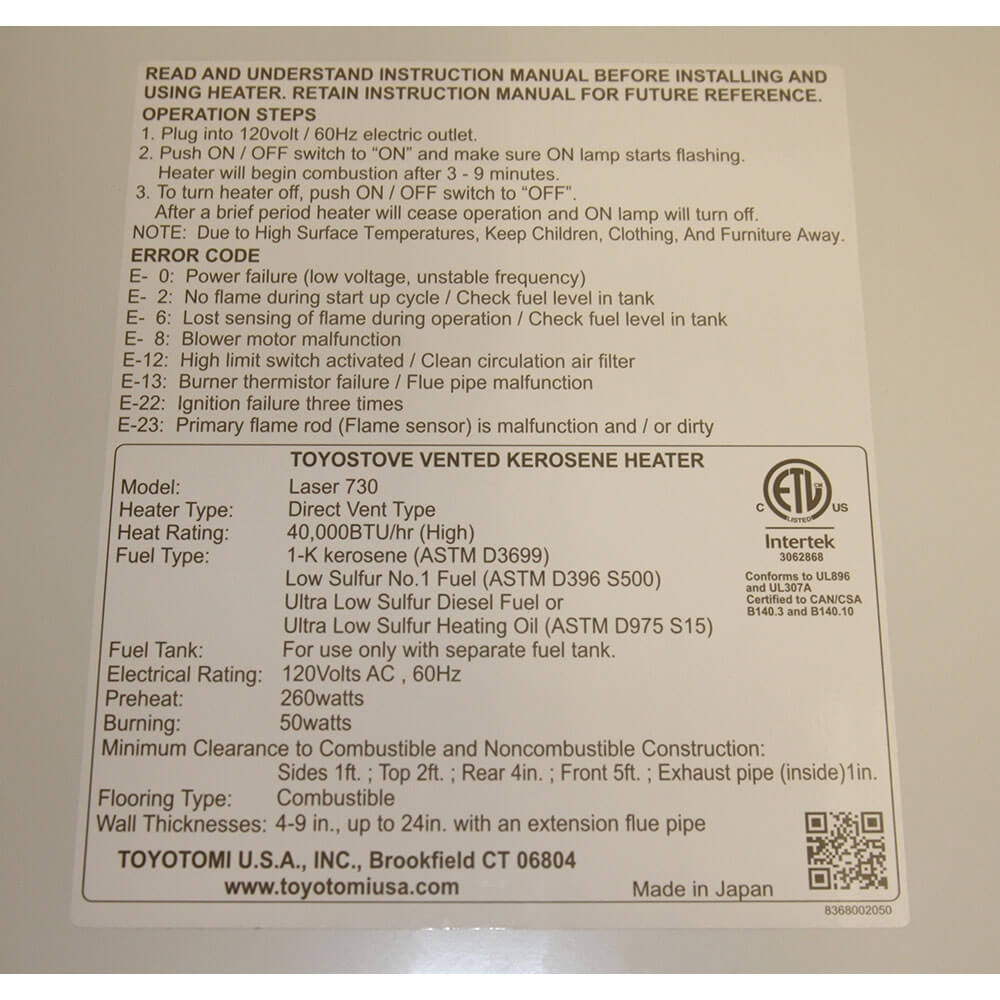 Toyotomi Toyostove Laser 730 Laser 730, Left Side Panel is located next to Right Side Panel and Front Panel Assembly.