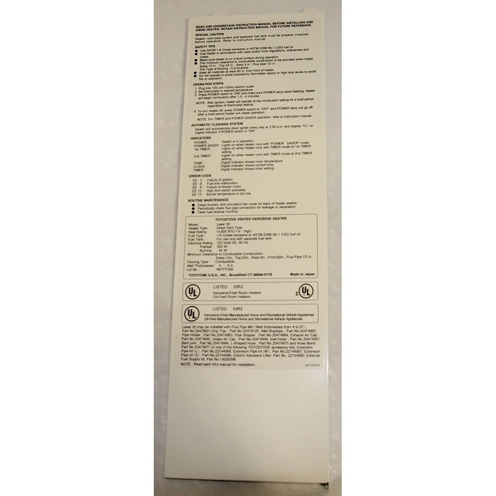 Toyotomi Toyostove Laser 30 Panel Left is located next to Panel Rear.