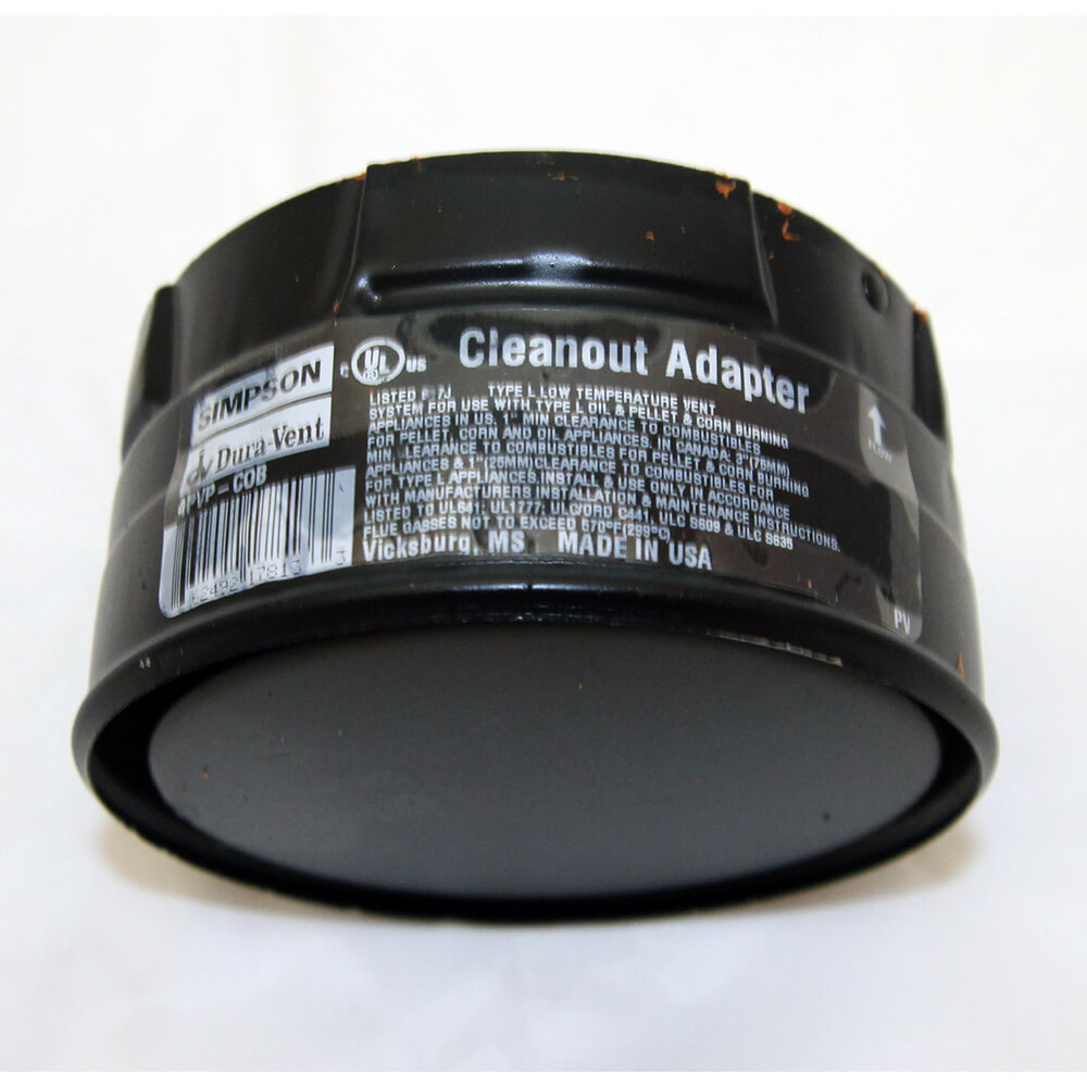 The DuraVent PelletVent Pro Clean-Out Tee Cap, part number 4PVP-COB1, is a 4-inch black replacement cap used to close the clean-out opening on a PelletVent Pro tee assembly. It is intended for pellet vent systems that require periodic access for ash removal and inspection. This component restores the lower tee closure after service and helps maintain the correct vent path within the listed system.