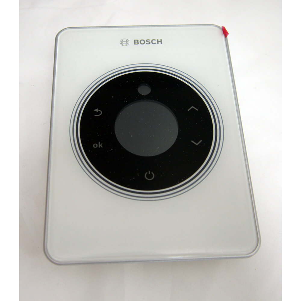 The Bosch Wired Remote with WiFi, part number 7736504945, is a wired wall-mounted remote control with integrated Wi-Fi connectivity designed to allow temperature adjustment, status monitoring, error code management, and app-based remote control of compatible Bosch Therm tankless gas water heaters from a permanent wall-mounted location or from anywhere via the free Bosch Water app on a connected mobile device.