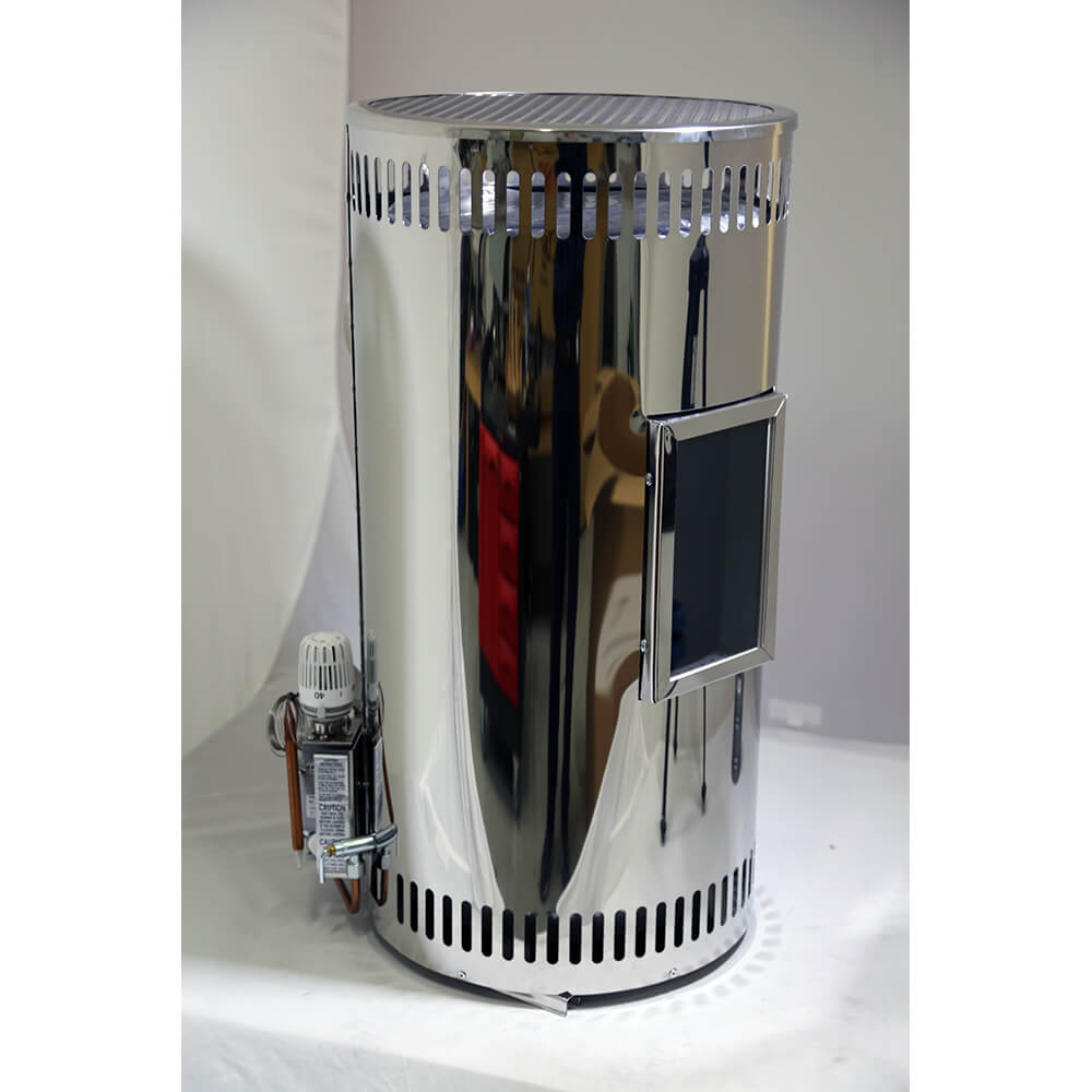 NordicStove Rustic Model: The Rustic model combines both durability and style with its stainless steel construction and convection heating. Its convection system is designed with slots at the top and bottom of the cover for increased airflow and heating efficiency. This method of heating, called convection heating, circulates warm air using natural convection currents. In addition to its practical features, the Rustic model also has a viewing window that allows for an aesthetically pleasing element to your space. Watching the flames can also create a cozy and comforting atmosphere.