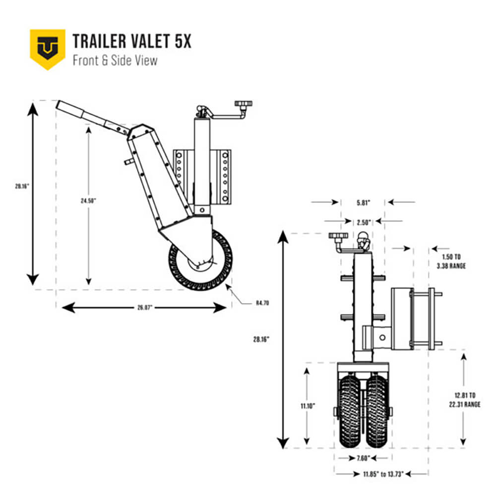 The Trailer Valet 5X is pound-for-pound the finest in its class for its towing capability and compact design, and its built-in jack demonstrates remarkable versatility. Instead of driving your vehicle to the trailer, you can use this heavy-duty jack to pull the trailer to your hitch vehicle. The 5X makes it simple to park or transfer your trailer into narrow spaces or driveways, as well as into a garage. It enables you to take curves and make minor steering adjustments while the trailer is in motion. It has a trailer weight capability of 5,000 pounds and a tongue weight capacity of 500 pounds.